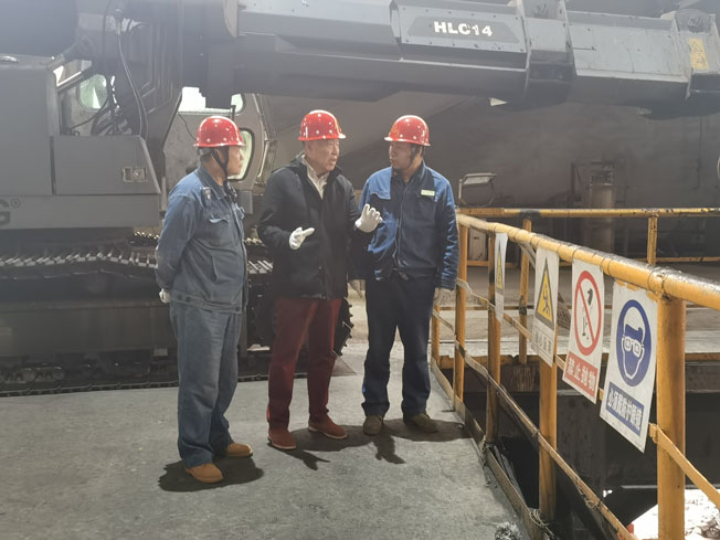 董事長(左二)在煉鋼廠檢修現(xiàn)場視察,公司副總調(diào)度長李成哲(左一)、煉鋼廠廠長閆海龍(右一)等主要領導全程陪同